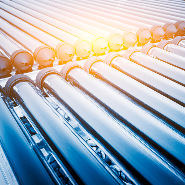 Solar Thermal harnesses the energy from the sun to heat water held within dark panels, this warm water is then transferred to a hot water cylinder for distribution.